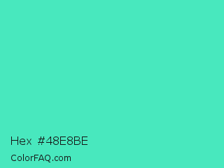Hex #48e8be Color is a normal cyan color and the nearest color is Turquoise #40e0d0. Hex code #48e8be and RGB value is rgb(72,232,190). In RGB color space, this color is composed of 28% red, 91% green, 75% blue, In CMYK color space, this color is composed of 69% cyan, 0% magenta, 18% yellow , 9% black , In HSL color space, this color has a hue angle of 164° , 78% saturation and 60% lightness.
