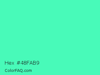 Hex #48fab9 Color is a light green color and the nearest color is Turquoise #40e0d0. Hex code #48fab9 and RGB value is rgb(72,250,185). In RGB color space, this color is composed of 28% red, 98% green, 73% blue, In CMYK color space, this color is composed of 71% cyan, 0% magenta, 26% yellow , 2% black , In HSL color space, this color has a hue angle of 158° , 95% saturation and 63% lightness.