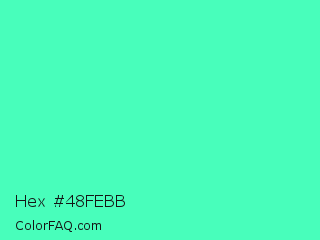 Hex #48febb Color is a light green color and the nearest color is Turquoise #40e0d0. Hex code #48febb and RGB value is rgb(72,254,187). In RGB color space, this color is composed of 28% red, 100% green, 73% blue, In CMYK color space, this color is composed of 72% cyan, 0% magenta, 26% yellow , 0% black , In HSL color space, this color has a hue angle of 158° , 99% saturation and 64% lightness.