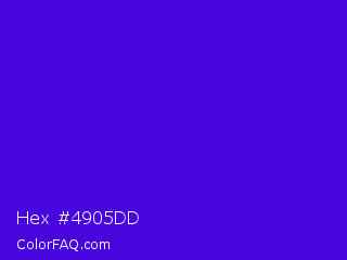 Hex #4905dd Color is a normal indigo color and the nearest color is Interdimensional Blue #360ccc. Hex code #4905dd and RGB value is rgb(73,5,221). In RGB color space, this color is composed of 29% red, 2% green, 87% blue, In CMYK color space, this color is composed of 67% cyan, 98% magenta, 0% yellow , 13% black , In HSL color space, this color has a hue angle of 259° , 96% saturation and 44% lightness.