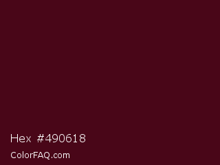 Hex #490618 Color is a very dark rose color and the nearest color is Cab Sav #4d0a18. Hex code #490618 and RGB value is rgb(73,6,24). In RGB color space, this color is composed of 29% red, 2% green, 9% blue, In CMYK color space, this color is composed of 0% cyan, 92% magenta, 67% yellow , 71% black , In HSL color space, this color has a hue angle of 344° , 85% saturation and 15% lightness.