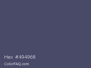 Hex #494968 Color is a normal blue color and the nearest color is Mulled Wine #4e4562. Hex code #494968 and RGB value is rgb(73,73,104). In RGB color space, this color is composed of 29% red, 29% green, 41% blue, In CMYK color space, this color is composed of 30% cyan, 30% magenta, 0% yellow , 59% black , In HSL color space, this color has a hue angle of 240° , 18% saturation and 35% lightness.