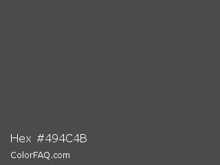 Hex #494c4b Color is a dark green color and the nearest color is Gravel #4a444b. Hex code #494c4b and RGB value is rgb(73,76,75). In RGB color space, this color is composed of 29% red, 30% green, 29% blue, In CMYK color space, this color is composed of 4% cyan, 0% magenta, 1% yellow , 70% black , In HSL color space, this color has a hue angle of 160° , 2% saturation and 29% lightness.