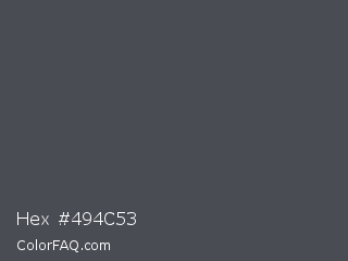 Hex #494c53 Color is a normal blue color and the nearest color is Abbey #4c4f56. Hex code #494c53 and RGB value is rgb(73,76,83). In RGB color space, this color is composed of 29% red, 30% green, 33% blue, In CMYK color space, this color is composed of 12% cyan, 8% magenta, 0% yellow , 67% black , In HSL color space, this color has a hue angle of 222° , 6% saturation and 31% lightness.