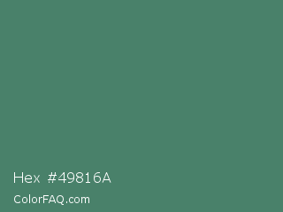 Hex #49816a Color is a normal green color and the nearest color is Hookers Green #49796b. Hex code #49816a and RGB value is rgb(73,129,106). In RGB color space, this color is composed of 29% red, 51% green, 42% blue, In CMYK color space, this color is composed of 43% cyan, 0% magenta, 18% yellow , 49% black , In HSL color space, this color has a hue angle of 155° , 28% saturation and 40% lightness.