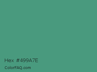 Hex #499a7e Color is a normal green color and the nearest color is Ocean Green #41aa78. Hex code #499a7e and RGB value is rgb(73,154,126). In RGB color space, this color is composed of 29% red, 60% green, 49% blue, In CMYK color space, this color is composed of 53% cyan, 0% magenta, 18% yellow , 40% black , In HSL color space, this color has a hue angle of 159° , 36% saturation and 45% lightness.