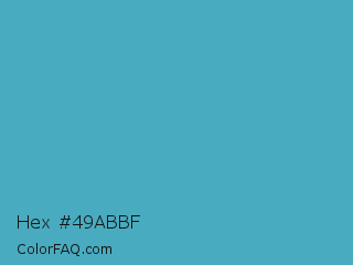 Hex #49abbf Color is a normal cyan color and the nearest color is Pelorous #3eabbf. Hex code #49abbf and RGB value is rgb(73,171,191). In RGB color space, this color is composed of 29% red, 67% green, 75% blue, In CMYK color space, this color is composed of 62% cyan, 10% magenta, 0% yellow , 25% black , In HSL color space, this color has a hue angle of 190° , 48% saturation and 52% lightness.