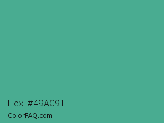 Hex #49ac91 Color is a normal cyan color and the nearest color is Mint #3eb489. Hex code #49ac91 and RGB value is rgb(73,172,145). In RGB color space, this color is composed of 29% red, 67% green, 57% blue, In CMYK color space, this color is composed of 58% cyan, 0% magenta, 16% yellow , 33% black , In HSL color space, this color has a hue angle of 164° , 40% saturation and 48% lightness.