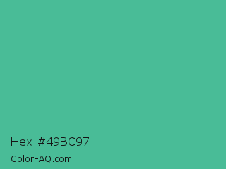 Hex #49bc97 Color is a normal green color and the nearest color is Ocean Green #48bf91. Hex code #49bc97 and RGB value is rgb(73,188,151). In RGB color space, this color is composed of 29% red, 74% green, 59% blue, In CMYK color space, this color is composed of 61% cyan, 0% magenta, 20% yellow , 26% black , In HSL color space, this color has a hue angle of 161° , 46% saturation and 51% lightness.