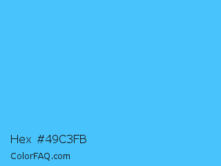 Hex #49c3fb Color is a light blue color and the nearest color is Picton Blue #45b1e8. Hex code #49c3fb and RGB value is rgb(73,195,251). In RGB color space, this color is composed of 29% red, 76% green, 98% blue, In CMYK color space, this color is composed of 71% cyan, 22% magenta, 0% yellow , 2% black , In HSL color space, this color has a hue angle of 199° , 96% saturation and 64% lightness.