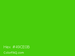 Hex #49ce0b Color is a normal green color and the nearest color is Harlequin Green #46cb18. Hex code #49ce0b and RGB value is rgb(73,206,11). In RGB color space, this color is composed of 29% red, 81% green, 4% blue, In CMYK color space, this color is composed of 65% cyan, 0% magenta, 95% yellow , 19% black , In HSL color space, this color has a hue angle of 101° , 90% saturation and 43% lightness.