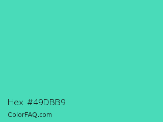 Hex #49dbb9 Color is a normal cyan color and the nearest color is Eucalyptus #44d7a8. Hex code #49dbb9 and RGB value is rgb(73,219,185). In RGB color space, this color is composed of 29% red, 86% green, 73% blue, In CMYK color space, this color is composed of 67% cyan, 0% magenta, 16% yellow , 14% black , In HSL color space, this color has a hue angle of 166° , 67% saturation and 57% lightness.