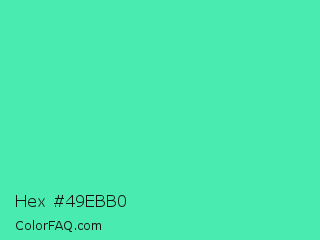 Hex #49ebb0 Color is a normal green color and the nearest color is Eucalyptus #44d7a8. Hex code #49ebb0 and RGB value is rgb(73,235,176). In RGB color space, this color is composed of 29% red, 92% green, 69% blue, In CMYK color space, this color is composed of 69% cyan, 0% magenta, 25% yellow , 8% black , In HSL color space, this color has a hue angle of 158° , 80% saturation and 60% lightness.