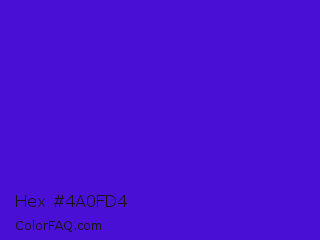 Hex #4a0fd4 Color is a normal indigo color and the nearest color is Interdimensional Blue #360ccc. Hex code #4a0fd4 and RGB value is rgb(74,15,212). In RGB color space, this color is composed of 29% red, 6% green, 83% blue, In CMYK color space, this color is composed of 65% cyan, 93% magenta, 0% yellow , 17% black , In HSL color space, this color has a hue angle of 258° , 87% saturation and 45% lightness.