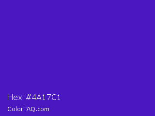 Hex #4a17c1 Color is a normal indigo color and the nearest color is Interdimensional Blue #360ccc. Hex code #4a17c1 and RGB value is rgb(74,23,193). In RGB color space, this color is composed of 29% red, 9% green, 76% blue, In CMYK color space, this color is composed of 62% cyan, 88% magenta, 0% yellow , 24% black , In HSL color space, this color has a hue angle of 258° , 79% saturation and 42% lightness.