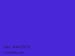 Hex #4a26d9 Color is a normal indigo color and the nearest color is Interdimensional Blue #360ccc. Hex code #4a26d9 and RGB value is rgb(74,38,217). In RGB color space, this color is composed of 29% red, 15% green, 85% blue, In CMYK color space, this color is composed of 66% cyan, 82% magenta, 0% yellow , 15% black , In HSL color space, this color has a hue angle of 252° , 70% saturation and 50% lightness.