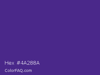 Hex #4a288a Color is a normal violet color and the nearest color is KSU Purple #512888. Hex code #4a288a and RGB value is rgb(74,40,138). In RGB color space, this color is composed of 29% red, 16% green, 54% blue, In CMYK color space, this color is composed of 46% cyan, 71% magenta, 0% yellow , 46% black , In HSL color space, this color has a hue angle of 261° , 55% saturation and 35% lightness.