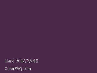 Hex #4a2a48 Color is a dark magenta color and the nearest color is Bossanova #4e2a5a. Hex code #4a2a48 and RGB value is rgb(74,42,72). In RGB color space, this color is composed of 29% red, 16% green, 28% blue, In CMYK color space, this color is composed of 0% cyan, 43% magenta, 3% yellow , 71% black , In HSL color space, this color has a hue angle of 304° , 28% saturation and 23% lightness.