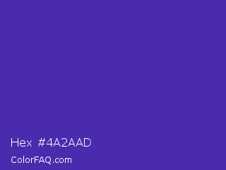 Hex #4a2aad Color is a normal indigo color and the nearest color is Daisy Bush #4f2398. Hex code #4a2aad and RGB value is rgb(74,42,173). In RGB color space, this color is composed of 29% red, 16% green, 68% blue, In CMYK color space, this color is composed of 57% cyan, 76% magenta, 0% yellow , 32% black , In HSL color space, this color has a hue angle of 255° , 61% saturation and 42% lightness.