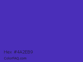 Hex #4a2eb9 Color is a normal indigo color and the nearest color is Ocean Blue #4f42b5. Hex code #4a2eb9 and RGB value is rgb(74,46,185). In RGB color space, this color is composed of 29% red, 18% green, 73% blue, In CMYK color space, this color is composed of 60% cyan, 75% magenta, 0% yellow , 27% black , In HSL color space, this color has a hue angle of 252° , 60% saturation and 45% lightness.