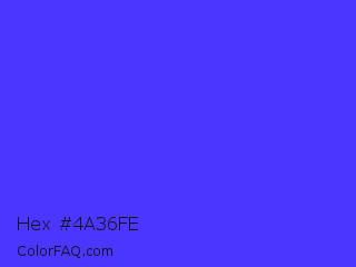 Hex #4a36fe Color is a normal indigo color and the nearest color is Han Purple #5218fa. Hex code #4a36fe and RGB value is rgb(74,54,254). In RGB color space, this color is composed of 29% red, 21% green, 100% blue, In CMYK color space, this color is composed of 71% cyan, 79% magenta, 0% yellow , 0% black , In HSL color space, this color has a hue angle of 246° , 99% saturation and 60% lightness.