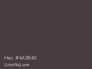 Hex #4a3b40 Color is a dark rose color and the nearest color is Matterhorn #4e3b41. Hex code #4a3b40 and RGB value is rgb(74,59,64). In RGB color space, this color is composed of 29% red, 23% green, 25% blue, In CMYK color space, this color is composed of 0% cyan, 20% magenta, 14% yellow , 71% black , In HSL color space, this color has a hue angle of 340° , 11% saturation and 26% lightness.