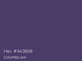 Hex #4a3b68 Color is a normal indigo color and the nearest color is Mulled Wine #4e4562. Hex code #4a3b68 and RGB value is rgb(74,59,104). In RGB color space, this color is composed of 29% red, 23% green, 41% blue, In CMYK color space, this color is composed of 29% cyan, 43% magenta, 0% yellow , 59% black , In HSL color space, this color has a hue angle of 260° , 28% saturation and 32% lightness.