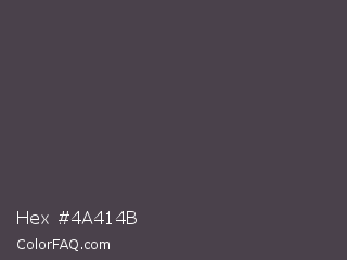 Hex #4a414b Color is a dark magenta color and the nearest color is Gravel #4a444b. Hex code #4a414b and RGB value is rgb(74,65,75). In RGB color space, this color is composed of 29% red, 25% green, 29% blue, In CMYK color space, this color is composed of 1% cyan, 13% magenta, 0% yellow , 71% black , In HSL color space, this color has a hue angle of 294° , 7% saturation and 27% lightness.