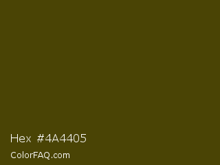 Hex #4a4405 Color is a very dark yellow color and the nearest color is Bronze Olive #4e420c. Hex code #4a4405 and RGB value is rgb(74,68,5). In RGB color space, this color is composed of 29% red, 27% green, 2% blue, In CMYK color space, this color is composed of 0% cyan, 8% magenta, 93% yellow , 71% black , In HSL color space, this color has a hue angle of 55° , 87% saturation and 15% lightness.