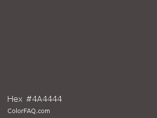 Hex #4a4444 Color is a dark red color and the nearest color is Tundora #4a4244. Hex code #4a4444 and RGB value is rgb(74,68,68). In RGB color space, this color is composed of 29% red, 27% green, 27% blue, In CMYK color space, this color is composed of 0% cyan, 8% magenta, 8% yellow , 71% black , In HSL color space, this color has a hue angle of 0° , 4% saturation and 28% lightness.