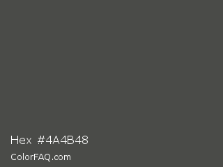 Hex #4a4b48 Color is a dark green color and the nearest color is Gravel #4a444b. Hex code #4a4b48 and RGB value is rgb(74,75,72). In RGB color space, this color is composed of 29% red, 29% green, 28% blue, In CMYK color space, this color is composed of 1% cyan, 0% magenta, 4% yellow , 71% black , In HSL color space, this color has a hue angle of 80° , 2% saturation and 29% lightness.