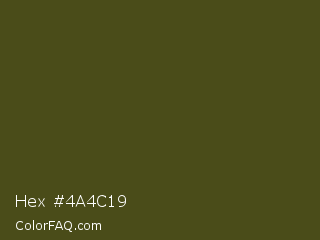 Hex #4a4c19 Color is a very dark yellow color and the nearest color is Army Green #4b5320. Hex code #4a4c19 and RGB value is rgb(74,76,25). In RGB color space, this color is composed of 29% red, 30% green, 10% blue, In CMYK color space, this color is composed of 3% cyan, 0% magenta, 67% yellow , 70% black , In HSL color space, this color has a hue angle of 62° , 50% saturation and 20% lightness.