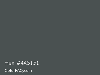 Hex #4a5151 Color is a dark cyan color and the nearest color is Abbey #4c4f56. Hex code #4a5151 and RGB value is rgb(74,81,81). In RGB color space, this color is composed of 29% red, 32% green, 32% blue, In CMYK color space, this color is composed of 9% cyan, 0% magenta, 0% yellow , 68% black , In HSL color space, this color has a hue angle of 180° , 5% saturation and 30% lightness.