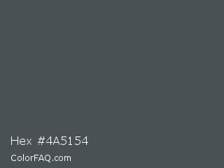 Hex #4a5154 Color is a normal blue color and the nearest color is Abbey #4c4f56. Hex code #4a5154 and RGB value is rgb(74,81,84). In RGB color space, this color is composed of 29% red, 32% green, 33% blue, In CMYK color space, this color is composed of 12% cyan, 4% magenta, 0% yellow , 67% black , In HSL color space, this color has a hue angle of 198° , 6% saturation and 31% lightness.