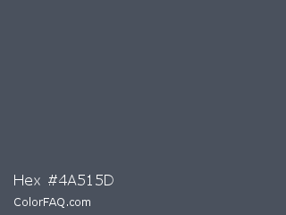 Hex #4a515d Color is a normal blue color and the nearest color is Trout #4a4e5a. Hex code #4a515d and RGB value is rgb(74,81,93). In RGB color space, this color is composed of 29% red, 32% green, 36% blue, In CMYK color space, this color is composed of 20% cyan, 13% magenta, 0% yellow , 64% black , In HSL color space, this color has a hue angle of 218° , 11% saturation and 33% lightness.