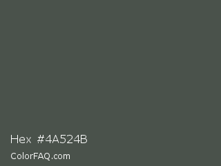 Hex #4a524b Color is a normal green color and the nearest color is Gray Asparagus #465945. Hex code #4a524b and RGB value is rgb(74,82,75). In RGB color space, this color is composed of 29% red, 32% green, 29% blue, In CMYK color space, this color is composed of 10% cyan, 0% magenta, 9% yellow , 68% black , In HSL color space, this color has a hue angle of 128° , 5% saturation and 31% lightness.
