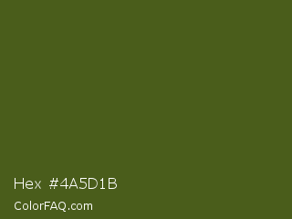 Hex #4a5d1b Color is a dark lime color and the nearest color is Dark Moss Green #4a5d23. Hex code #4a5d1b and RGB value is rgb(74,93,27). In RGB color space, this color is composed of 29% red, 36% green, 11% blue, In CMYK color space, this color is composed of 20% cyan, 0% magenta, 71% yellow , 64% black , In HSL color space, this color has a hue angle of 77° , 55% saturation and 24% lightness.
