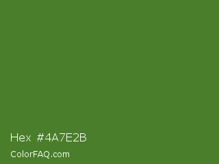 Hex #4a7e2b Color is a normal green color and the nearest color is Sap Green #507d2a. Hex code #4a7e2b and RGB value is rgb(74,126,43). In RGB color space, this color is composed of 29% red, 49% green, 17% blue, In CMYK color space, this color is composed of 41% cyan, 0% magenta, 66% yellow , 51% black , In HSL color space, this color has a hue angle of 98° , 49% saturation and 33% lightness.