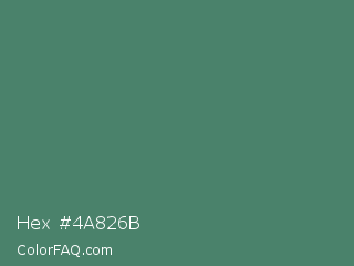 Hex #4a826b Color is a normal green color and the nearest color is Hookers Green #49796b. Hex code #4a826b and RGB value is rgb(74,130,107). In RGB color space, this color is composed of 29% red, 51% green, 42% blue, In CMYK color space, this color is composed of 43% cyan, 0% magenta, 18% yellow , 49% black , In HSL color space, this color has a hue angle of 155° , 27% saturation and 40% lightness.