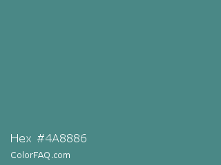 Hex #4a8886 Color is a normal cyan color and the nearest color is Smalt Blue #51808f. Hex code #4a8886 and RGB value is rgb(74,136,134). In RGB color space, this color is composed of 29% red, 53% green, 53% blue, In CMYK color space, this color is composed of 46% cyan, 0% magenta, 1% yellow , 47% black , In HSL color space, this color has a hue angle of 178° , 30% saturation and 41% lightness.