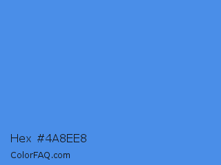 Hex #4a8ee8 Color is a normal blue color and the nearest color is Tufts Blue #3e8ede. Hex code #4a8ee8 and RGB value is rgb(74,142,232). In RGB color space, this color is composed of 29% red, 56% green, 91% blue, In CMYK color space, this color is composed of 68% cyan, 39% magenta, 0% yellow , 9% black , In HSL color space, this color has a hue angle of 214° , 77% saturation and 60% lightness.