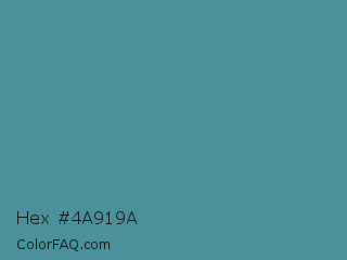 Hex #4a919a Color is a normal cyan color and the nearest color is Wedgewood #4e7f9e. Hex code #4a919a and RGB value is rgb(74,145,154). In RGB color space, this color is composed of 29% red, 57% green, 60% blue, In CMYK color space, this color is composed of 52% cyan, 6% magenta, 0% yellow , 40% black , In HSL color space, this color has a hue angle of 187° , 35% saturation and 45% lightness.
