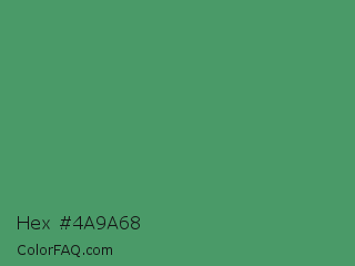 Hex #4a9a68 Color is a normal green color and the nearest color is Fruit Salad #4f9d5d. Hex code #4a9a68 and RGB value is rgb(74,154,104). In RGB color space, this color is composed of 29% red, 60% green, 41% blue, In CMYK color space, this color is composed of 52% cyan, 0% magenta, 32% yellow , 40% black , In HSL color space, this color has a hue angle of 143° , 35% saturation and 45% lightness.