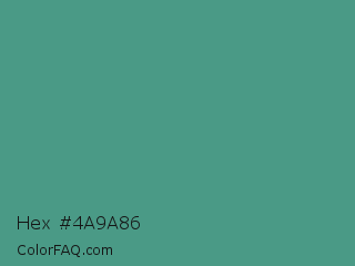 Hex #4a9a86 Color is a normal cyan color and the nearest color is Zomp #39a78e. Hex code #4a9a86 and RGB value is rgb(74,154,134). In RGB color space, this color is composed of 29% red, 60% green, 53% blue, In CMYK color space, this color is composed of 52% cyan, 0% magenta, 13% yellow , 40% black , In HSL color space, this color has a hue angle of 165° , 35% saturation and 45% lightness.