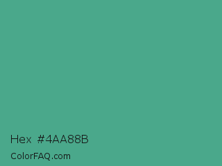 Hex #4aa88b Color is a normal green color and the nearest color is Mint #3eb489. Hex code #4aa88b and RGB value is rgb(74,168,139). In RGB color space, this color is composed of 29% red, 66% green, 55% blue, In CMYK color space, this color is composed of 56% cyan, 0% magenta, 17% yellow , 34% black , In HSL color space, this color has a hue angle of 161° , 39% saturation and 47% lightness.