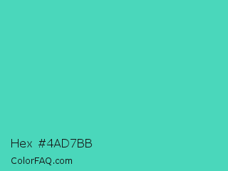Hex #4ad7bb Color is a normal cyan color and the nearest color is Medium Turquoise #48d1cc. Hex code #4ad7bb and RGB value is rgb(74,215,187). In RGB color space, this color is composed of 29% red, 84% green, 73% blue, In CMYK color space, this color is composed of 66% cyan, 0% magenta, 13% yellow , 16% black , In HSL color space, this color has a hue angle of 168° , 64% saturation and 57% lightness.