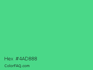 Hex #4ad888 Color is a normal green color and the nearest color is Emerald #50c878. Hex code #4ad888 and RGB value is rgb(74,216,136). In RGB color space, this color is composed of 29% red, 85% green, 53% blue, In CMYK color space, this color is composed of 66% cyan, 0% magenta, 37% yellow , 15% black , In HSL color space, this color has a hue angle of 146° , 65% saturation and 57% lightness.