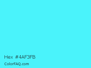Hex #4af3fb Color is a light cyan color and the nearest color is Turquoise Blue #6cdae7. Hex code #4af3fb and RGB value is rgb(74,243,251). In RGB color space, this color is composed of 29% red, 95% green, 98% blue, In CMYK color space, this color is composed of 71% cyan, 3% magenta, 0% yellow , 2% black , In HSL color space, this color has a hue angle of 183° , 96% saturation and 64% lightness.