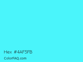 Hex #4af5fb Color is a light cyan color and the nearest color is Turquoise Blue #6cdae7. Hex code #4af5fb and RGB value is rgb(74,245,251). In RGB color space, this color is composed of 29% red, 96% green, 98% blue, In CMYK color space, this color is composed of 71% cyan, 2% magenta, 0% yellow , 2% black , In HSL color space, this color has a hue angle of 182° , 96% saturation and 64% lightness.