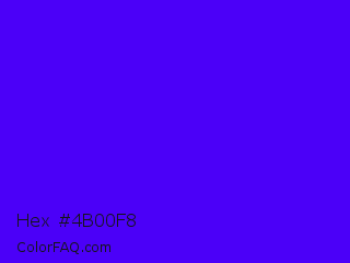 Hex #4b00f8 Color is a normal indigo color and the nearest color is Electric Ultramarine #3f00ff. Hex code #4b00f8 and RGB value is rgb(75,0,248). In RGB color space, this color is composed of 29% red, 0% green, 97% blue, In CMYK color space, this color is composed of 70% cyan, 100% magenta, 0% yellow , 3% black , In HSL color space, this color has a hue angle of 258° , 100% saturation and 49% lightness.